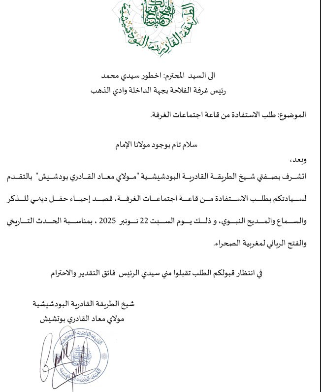توصّلت الجريدة بمراسلة صادرة عن الشيخ معاذ القادري بودشيش، أحد الوجوه التي تقدّم نفسها باعتبارها امتدادًا للطريقة القادرية البودشيشية، موجّهة إلى رئيس الغرفة الفلاحية لجهة الداخلة وادي الذهب، يطلب فيها تخصيص قاعة داخل مقر الغرفة لتنظيم نشاط ديني للطريقة يوم السبت 22 نونبر 2025. غير أنّ ما أثار الصدمة لم يكن الطلب الإداري نفسه، بل العبارة التي وردت في صدر الرسالة، والتي حملت مضمونًا لا يمكن وصفه إلا بأنه سقوط معرفي فاضح في قلب الصحراء المغربية.